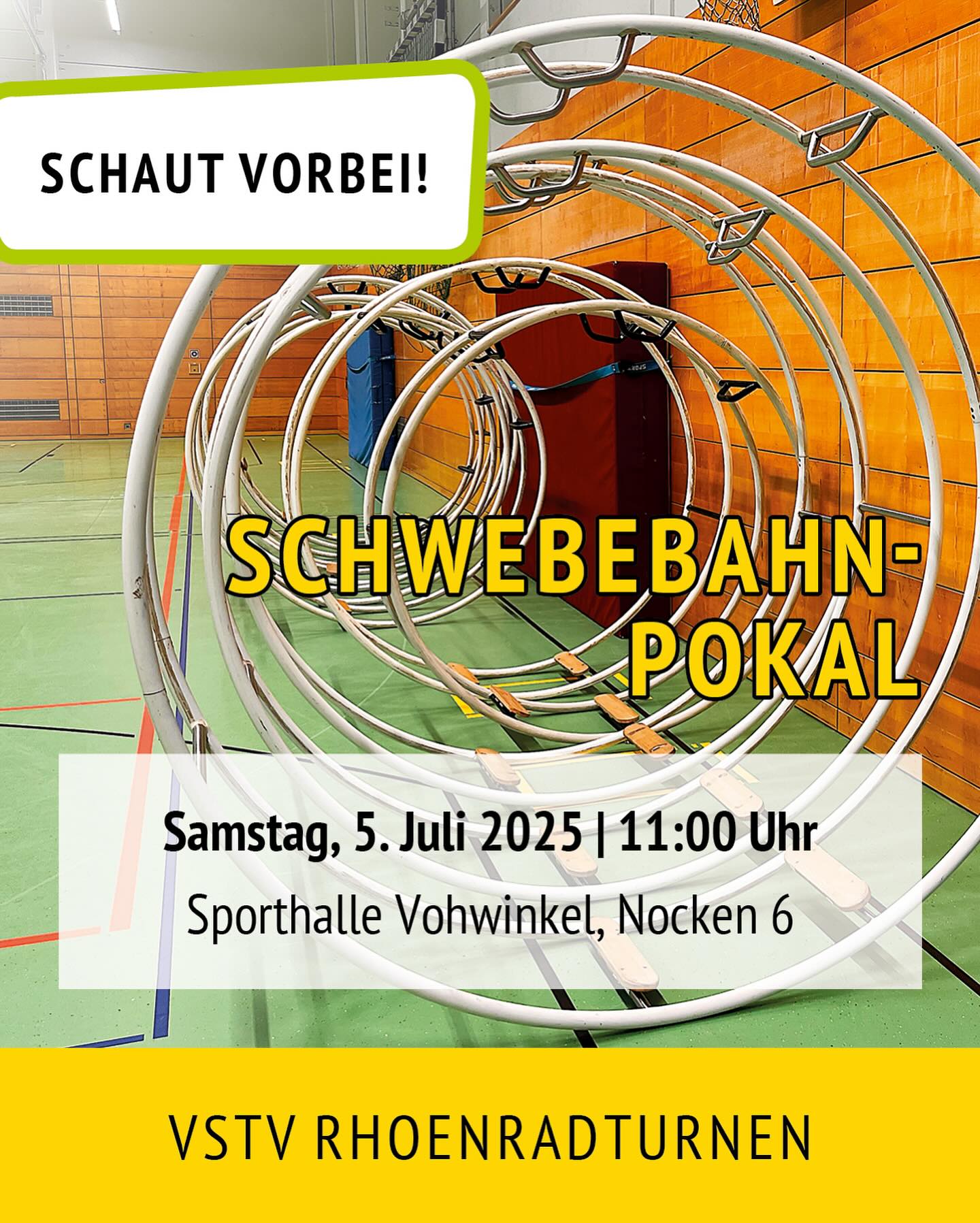 Am 5. Juli richtet die Abteilung Rhönradturnen im VSTV den Schwebebahnpokal aus. Ab 11:00 Uhr geht es in der Sporthalle Nocken rund. Rhönradturner*innen aus ganz NRW werden bei diesem Wettkampf um die Qualifikation zum Deutschlandcup antreten. Artistik im „großen Hamsterrad“ ist garantiert. Zuschauer*innen sind herzlich eingeladen vorbeizuschauen und können sich von dieser besonderen Sportart begeistern lassen. Eine Cafeteria wird auch angeboten.