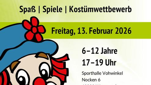 Kinder im Alter von 6-12 Jahren erwarten Spiele mit Musik und Tanz sowie ein Kostümwettbewerb. Für Snacks und Getränke wird gesorgt. Verkleidung, Hallenschuhe und gute Laune sind natürlich selbstverständlich. Kreative Verkleidung wird beim Kostümwettbewerb belohnt.