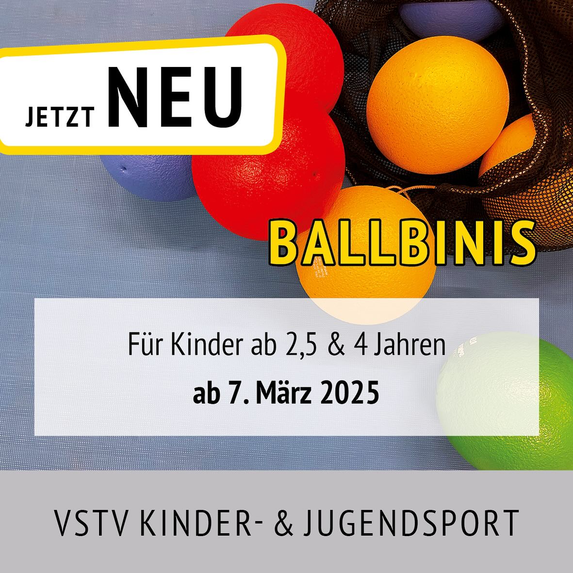 Eltern-Kind-Ballbinis für die 2,5-4-jährigen und die Ballbinis für 4-6-jährige, die dann schon ohne Eltern die Halle erobern.
